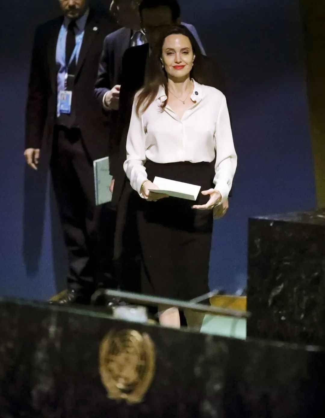 朱莉2019年联合国演讲就穿了这个组合,配简约首饰,更显精致。▼