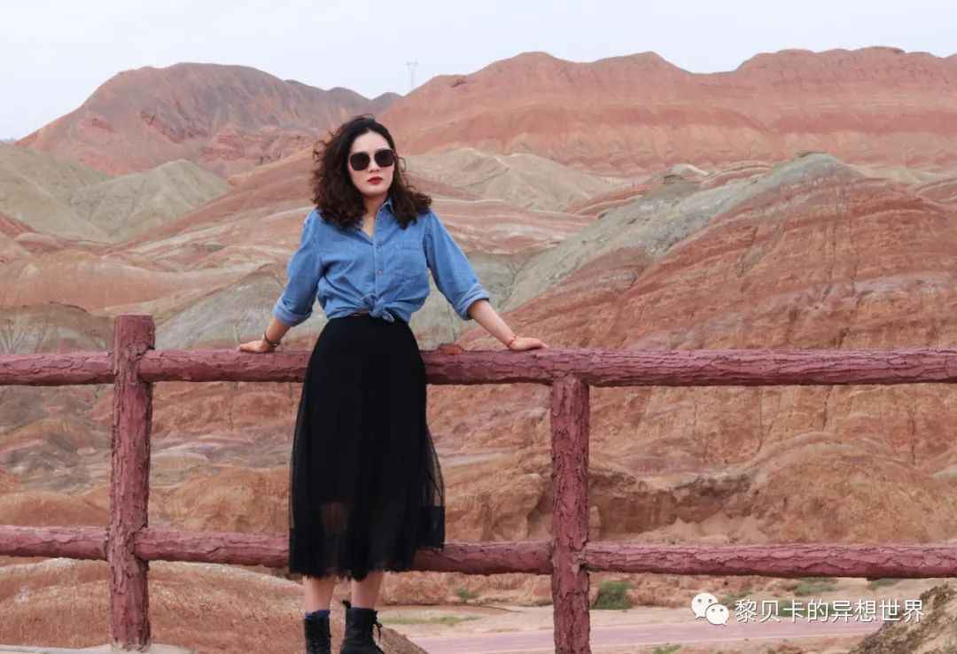 去张掖七彩丹霞,特意选蓝色牛仔外套对比红色地貌,配黑色纱裙和马丁靴,混搭风。▼