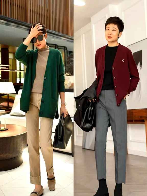 日常休闲穿两件针织套装加乐福鞋,温柔又舒服;商务场合用大衣配高领毛衣,专业又保暖。接送孙辈或家庭聚会,追求舒适自在,穿得有品就行。