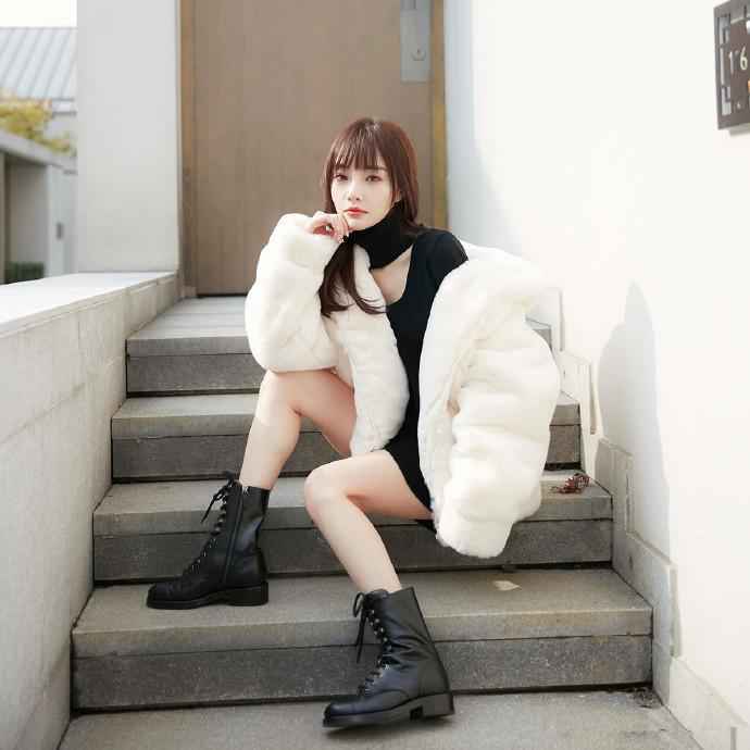 同样的搭配思路也可以用在经典黑白配中。这次李小璐用纯白面包服配黑色紧身短裙,整体简约大气又不失性感。内搭的黑色短裙不仅能修饰上身线条,还能秀出美腿。特别值得一提的是她搭配了马丁靴,让温柔造型中多了一丝不羁。