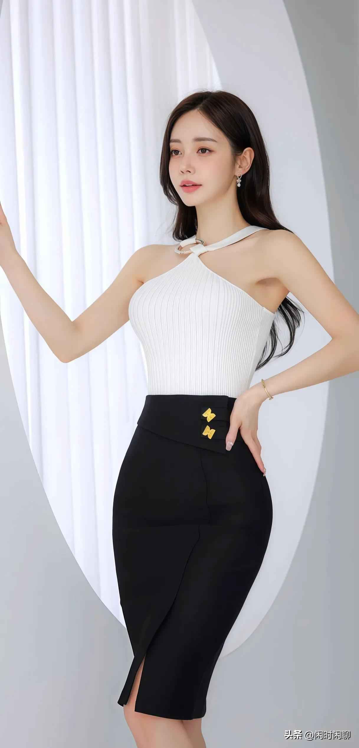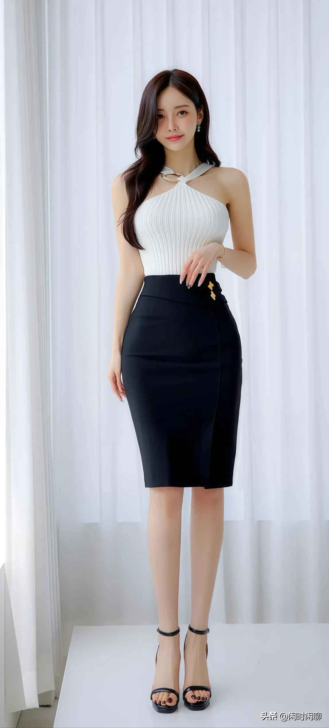 挂脖上衣搭配高腰开衩裙,金色扣子点缀,轻松穿出曲线感,时髦又利落