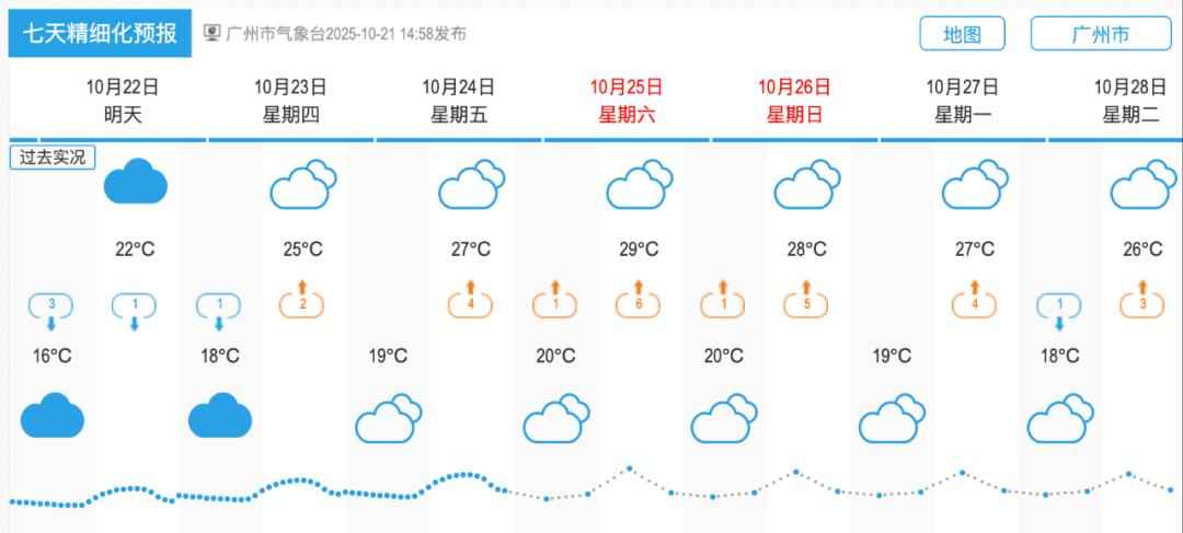 截图自社交平台。广州市气象台预报,10月21日—22日受台风和冷空气影响,广州有小雨,气温16~22℃,阵风较强。10月23日—25日转多云,气温回升。