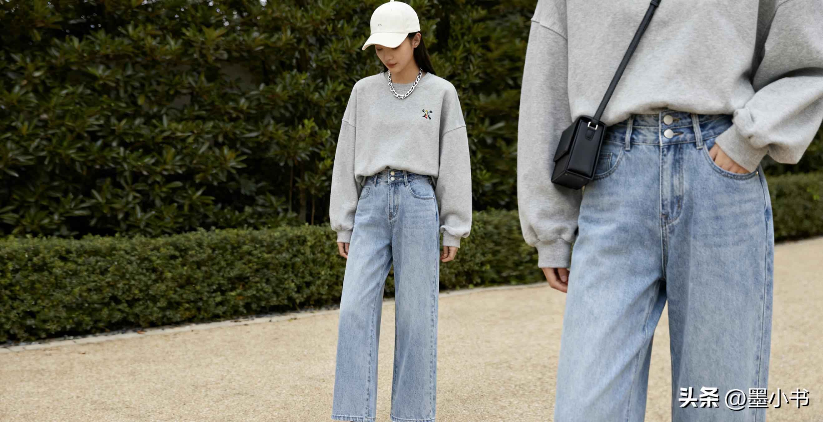 - 核心搭配:浅灰色廓形卫衣(带小刺绣设计) + 高腰阔腿牛仔裤(浅蓝色直筒款) + 白色板鞋 + 米白色棒球帽