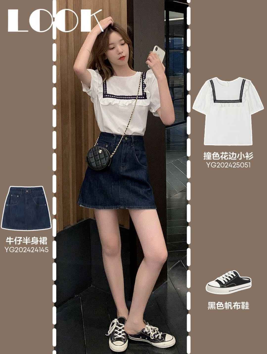 撞色花边上衣配牛仔A字裙,出门逛街这么穿简直太省心啦!花边设计增添精致感,A字裙摆完美修饰身材,再背个斜挎包,假期出游轻松搞定。