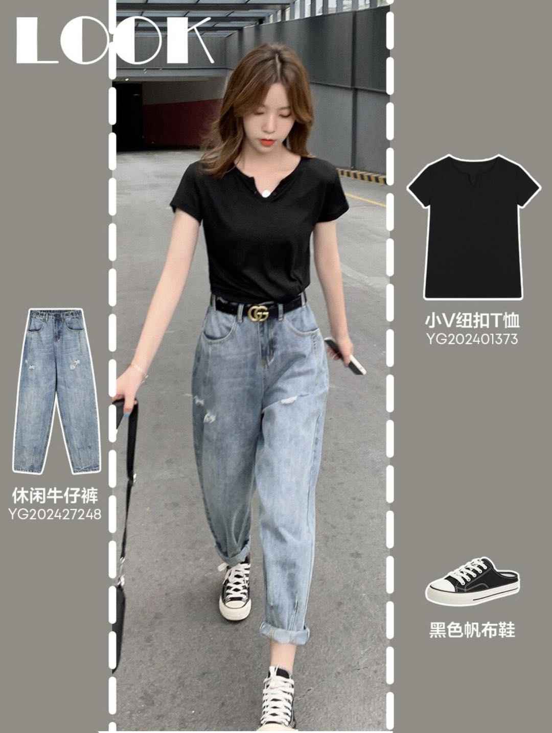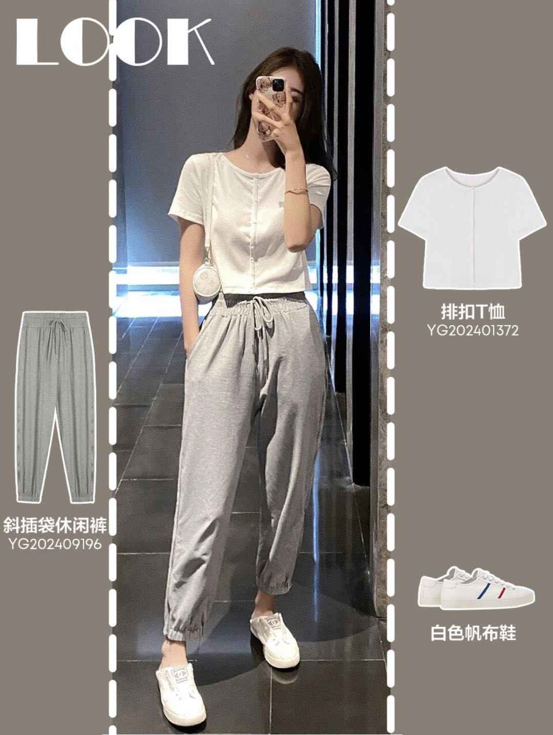 排扣T恤加工装休闲裤,姐妹聚会这么穿舒服又自在!简约风格不挑人,逛街走再多路也不累,还能悄悄显高哦。