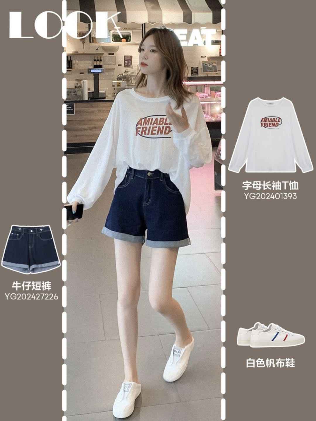 字母长袖T恤搭牛仔短裤,防晒又时尚!浅色系上衣清爽百搭,短裤露出双腿,记得涂好防晒,青春感瞬间拉满。