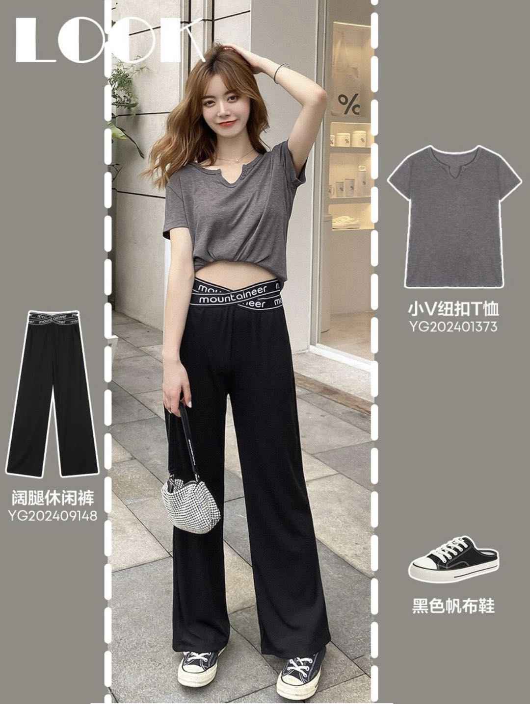 小V领纽扣T恤配高腰阔腿裤,旅行拍照超上镜!把衣角塞进裤子,微微露脐带点小性感,高腰裤立马穿出大长腿。