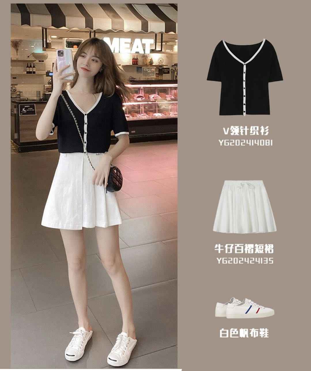 V领针织衫配牛仔百褶裙,黑白配色干净利落!适合走简约路线的女生,穿出低调的高级感。