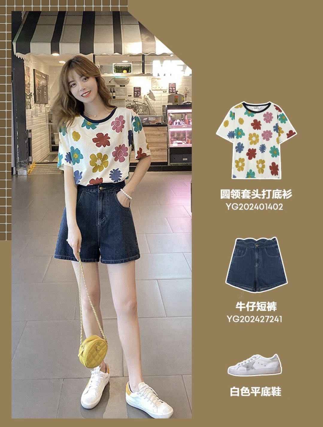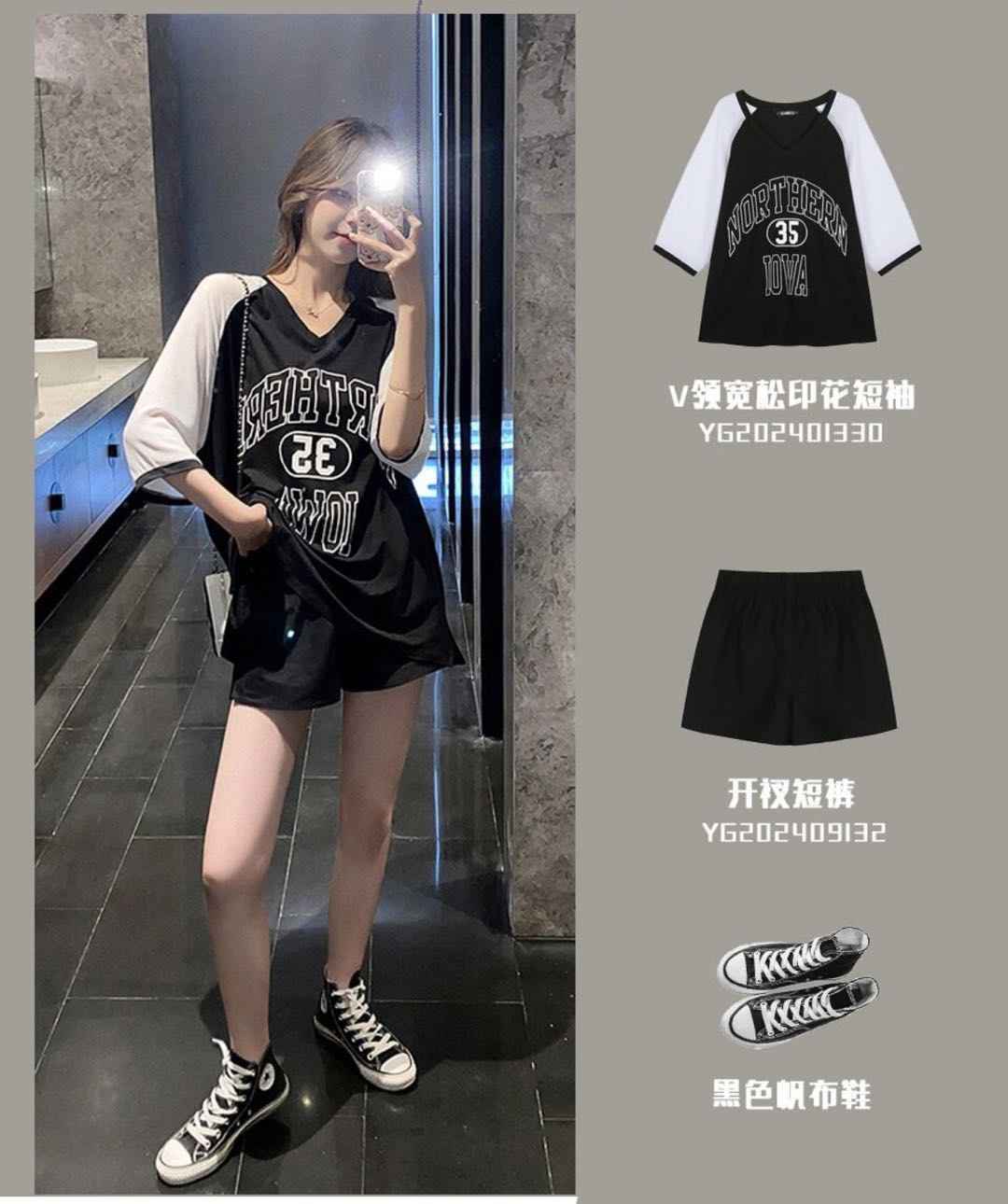 V领印花短袖配直筒短裤,甜酷风轻松拿捏!玩转下衣失踪穿法,个性十足又不失女人味。