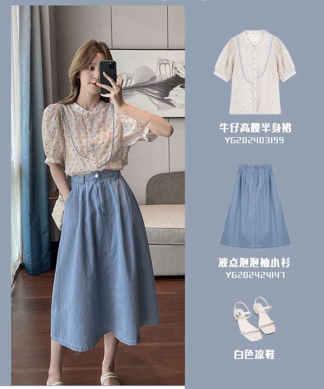泡泡袖小衫加牛仔半身裙,文艺范儿十足!清新减龄,特别适合梨形身材的女生,扬长避短穿出好比例。