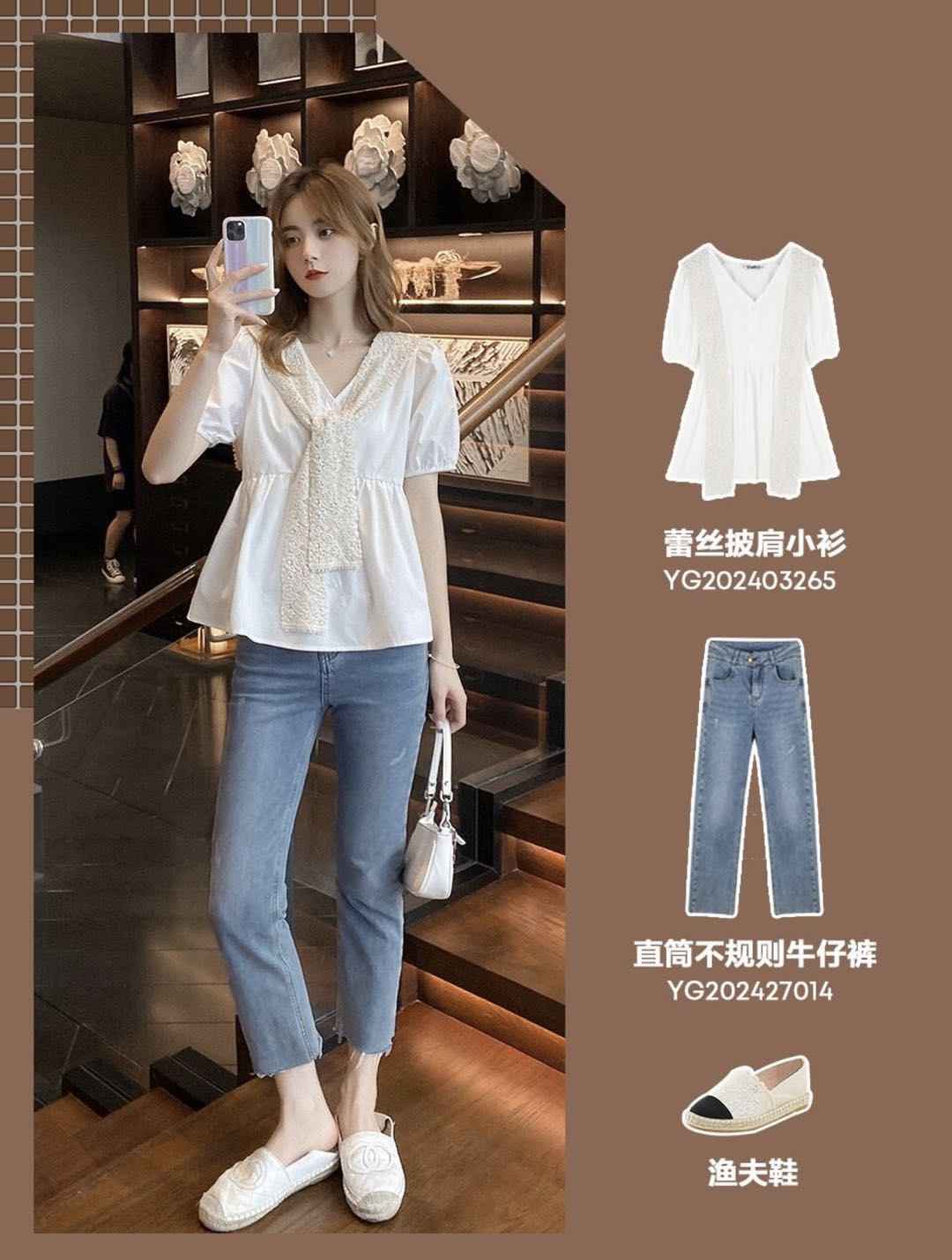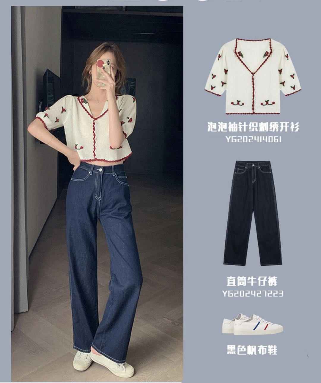 泡泡袖开衫搭直筒牛仔裤,藏肉效果一流!微泡泡袖遮住拜拜肉,直筒裤型显瘦显高,梨形身材也能轻松驾驭。