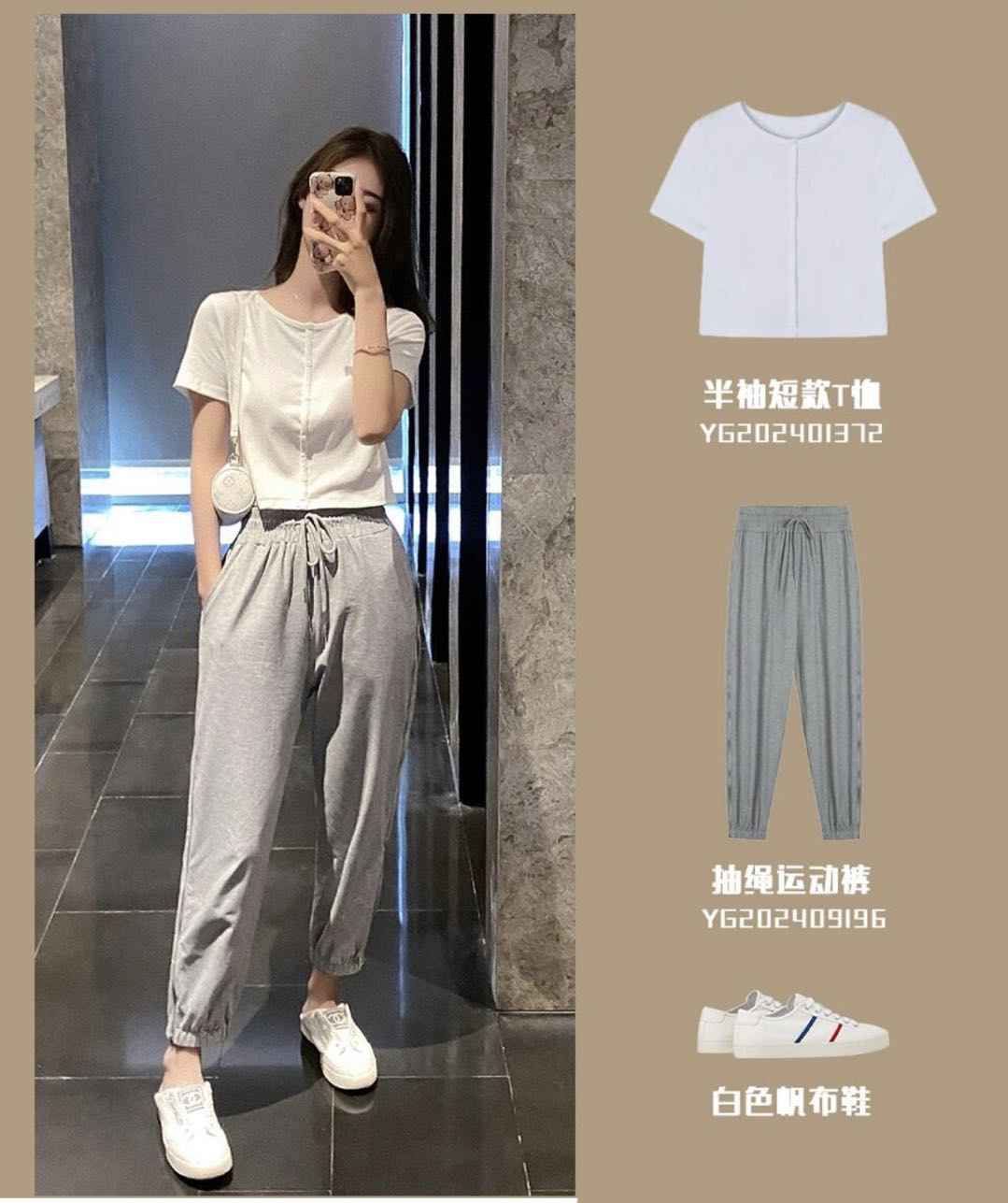 短款T恤配抽绳运动裤,运动风女孩看过来!利落有型,不挑身材,日常穿超舒服。
