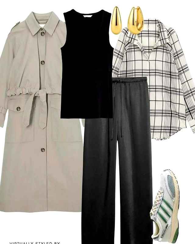 核心技巧是提高腰线:选短款上衣或把衣角塞进裤子。竖条纹、深色系有视觉收缩效果。鞋子与裤子同色能延长腿部线条,简单又有效。