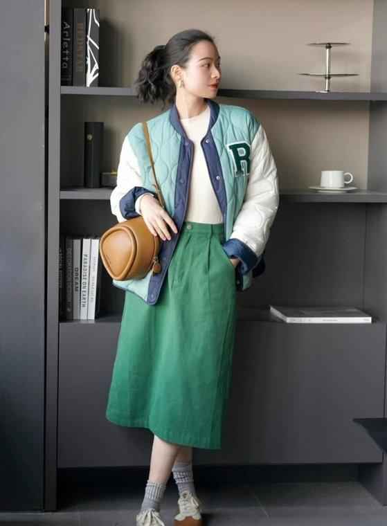 通勤就穿薄棉服配烟管裙和乐福鞋,休闲时换绗缝棉服搭针织裙和运动鞋,聚会场合来件新中式棉袄配真丝裙,加点珍珠饰品,贵气十足。