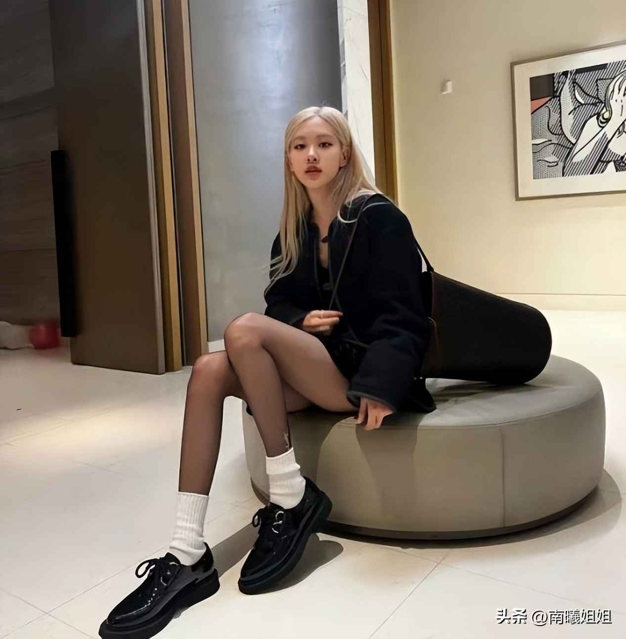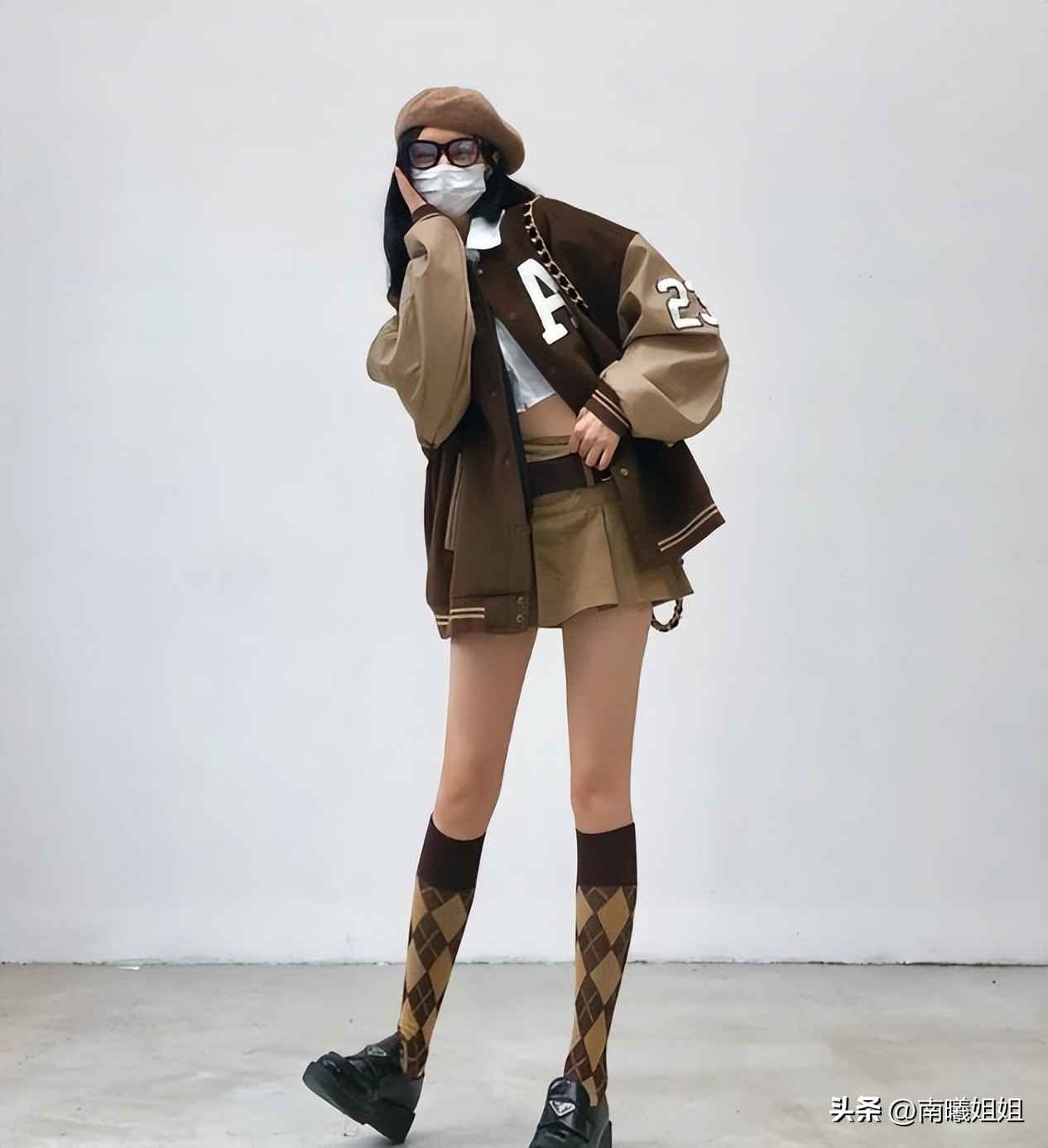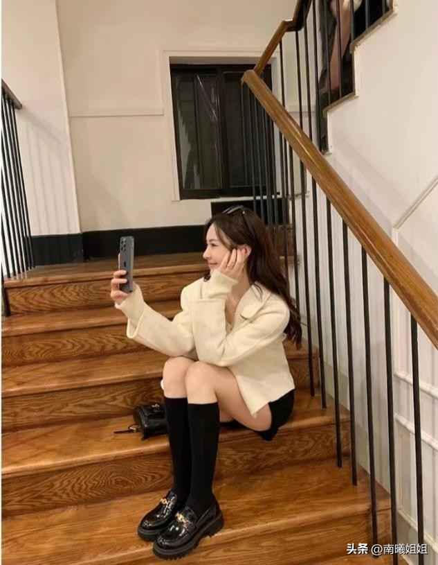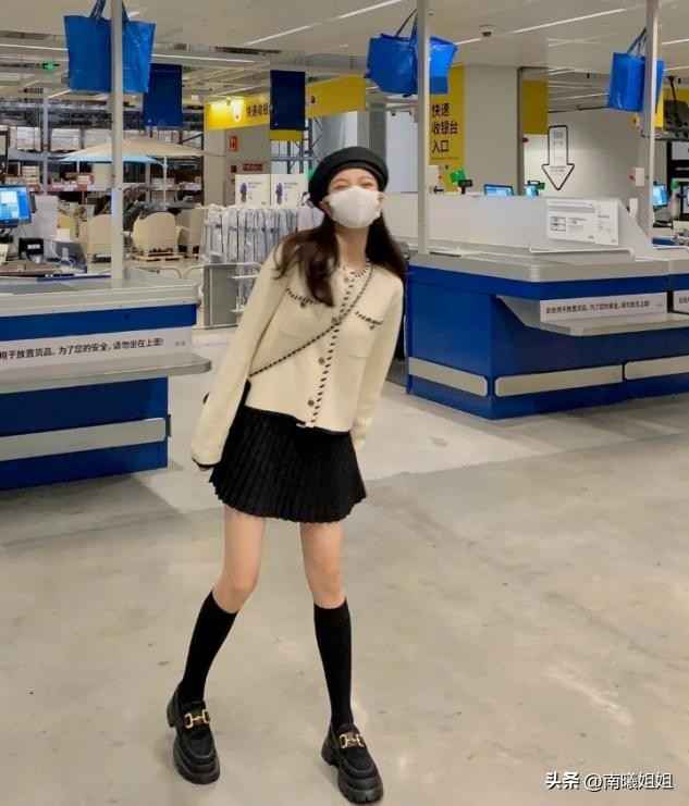 ○造型亮点:短裙能露腿,展示腿部线条,视觉上自然显高。乐福鞋配长袜,能替代长靴效果,避免厚重感。