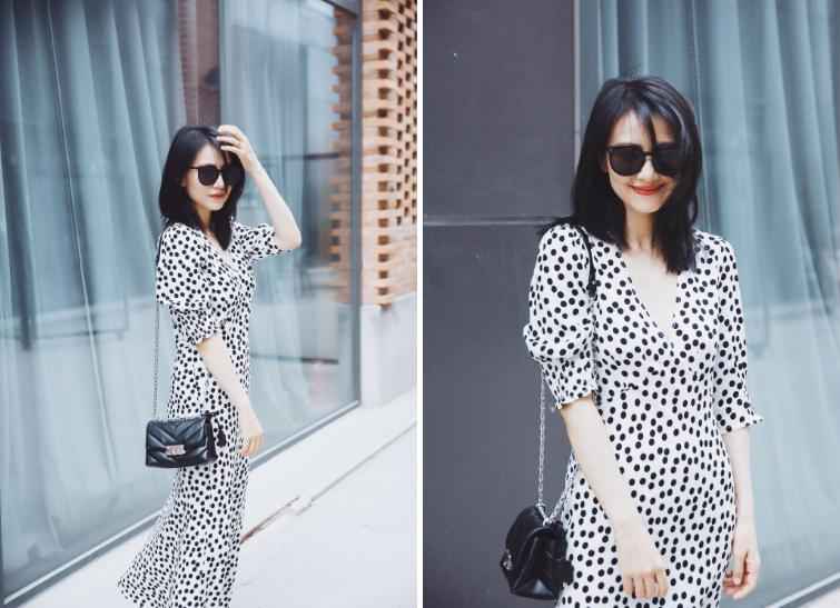 但设计元素别堆太多,一两种就够了,否则会显得杂乱。像这条黑白波点裙,泡泡袖加V领,既打破了单调,又能修饰脖子线条,显瘦又精致。