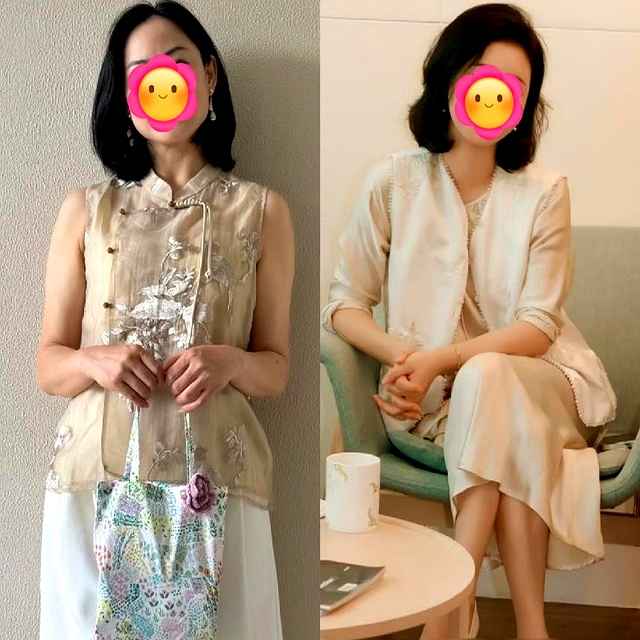 再说常见的大妈衫,很多阿姨还在穿那种花色鲜艳、图案繁琐的款式,比如格子或牡丹花,风一吹就贴身上,有时连内衣轮廓都透出来,走在街上小孩都说土气。我有次在南京姐姐家,她婆婆买了件杏色国风马甲,带盘扣和绣花,搭配白衬衫出门买菜,隔壁奶奶直问在哪买的。这种缎面马甲垂感好,不闷汗,还能修饰腰身和手臂,谁说年纪大了就不能穿得优雅?