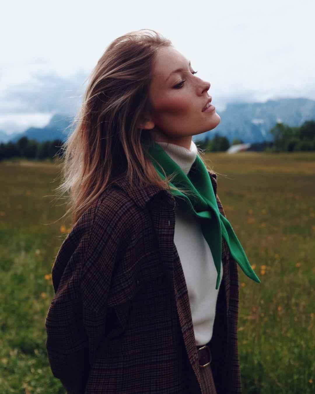 三角巾靠近脸部,选衬肤色的颜色最重要。如果不确定哪种颜色适合自己,绿色对亚洲人来说比较友好,一点点绿在脖子上,显得有生机,还能拯救各种深色外套。