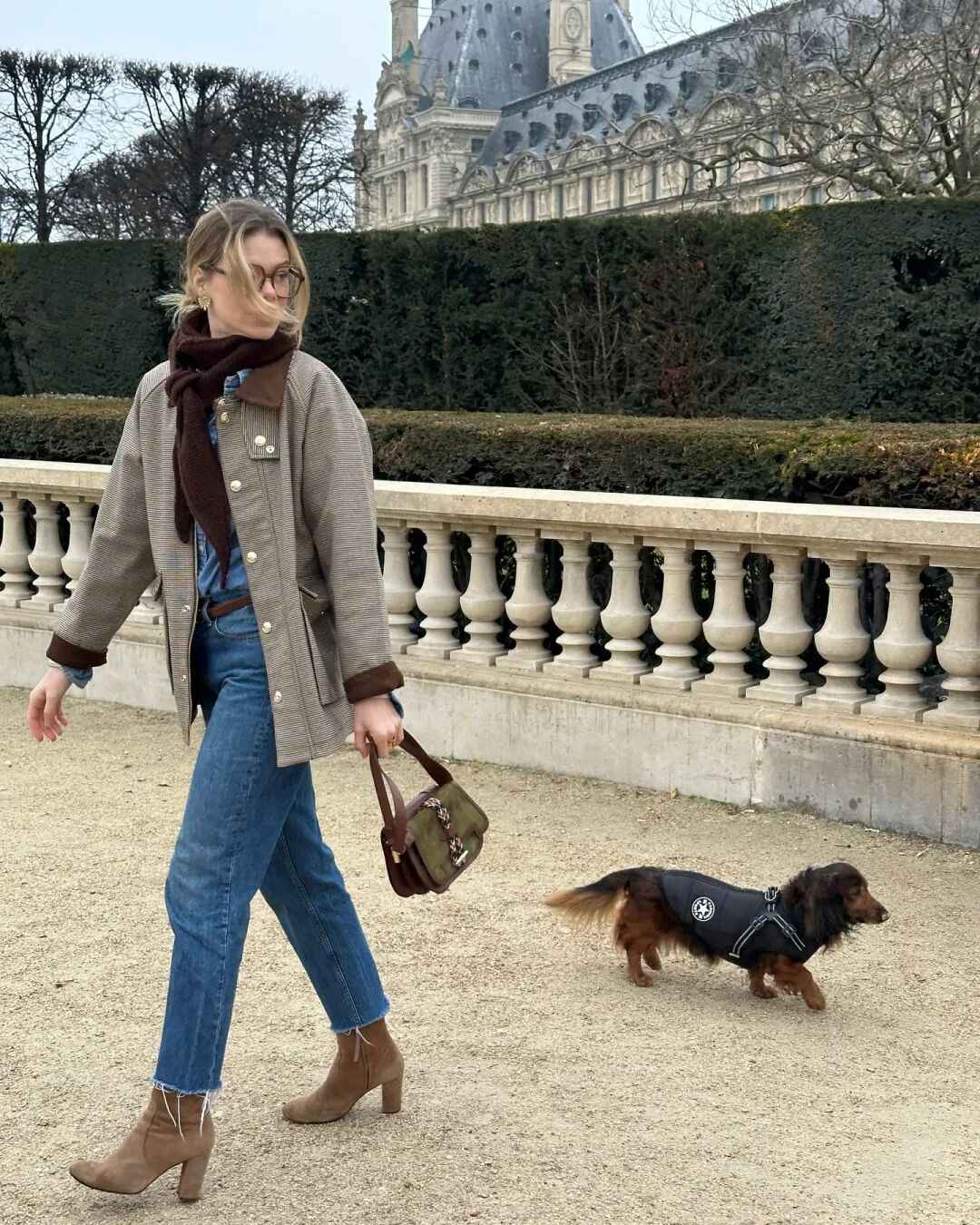 Hayley这身搭配可以直接抄作业,一身牛仔加麂皮棕色外套,再配绿色三角巾,配色高级又保暖。她这条来自苏格兰品牌TBCo,有多种颜色可选,参考价400+元。▼