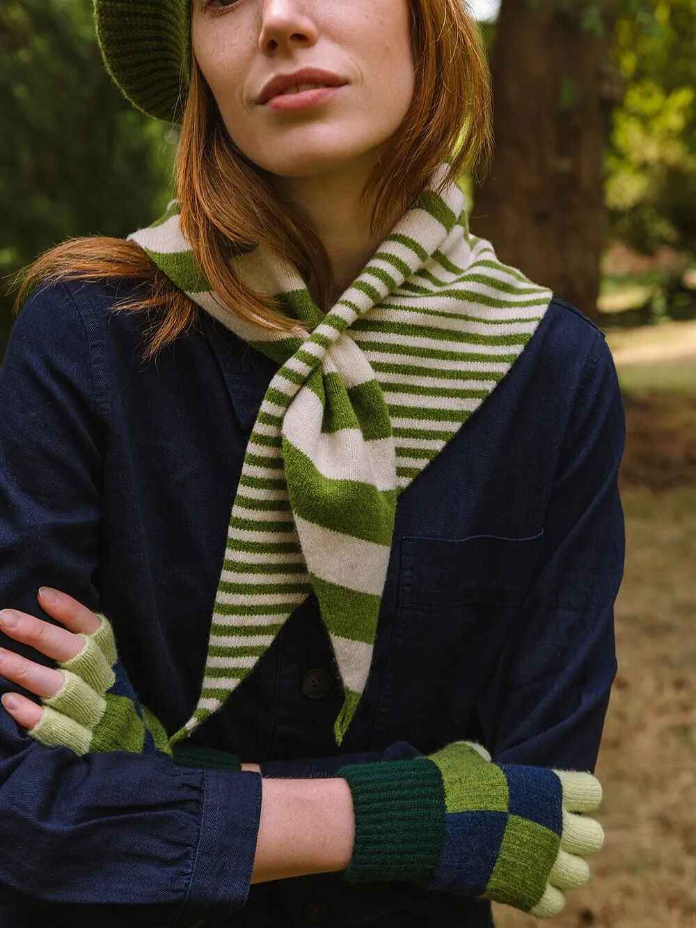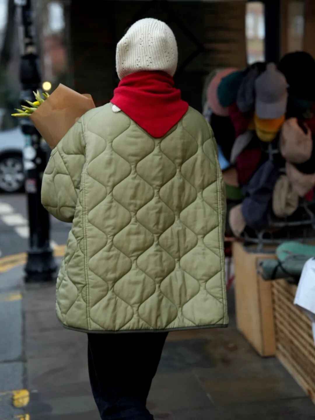 绿色三角巾配棕色外套,就像大地上的新芽,这个组合可以从秋天穿到春天。▼