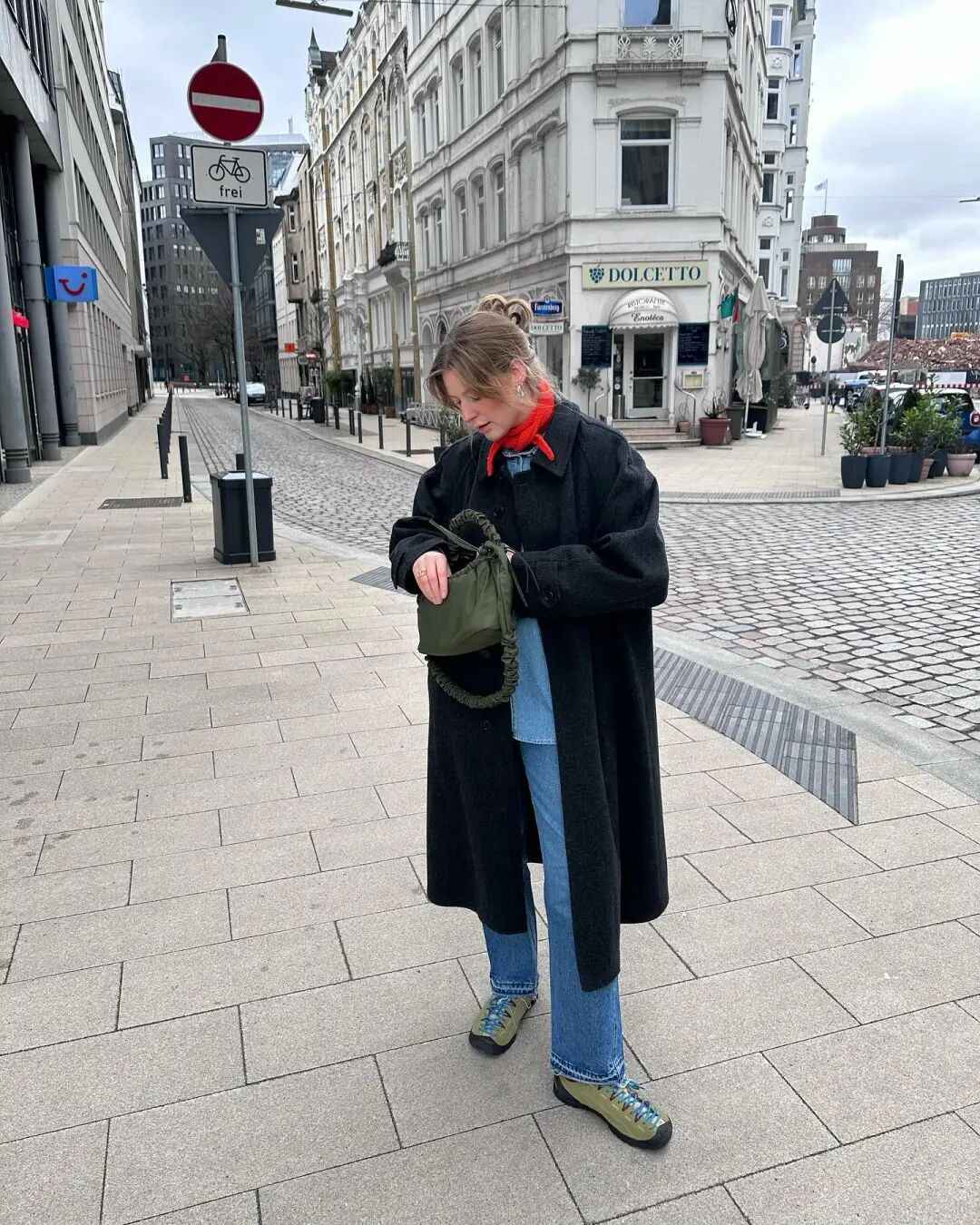 德国博主Emely这身配色很妙,主调是黑色和牛仔蓝,加入一点绿色和红色,瞬间打破黑色的沉闷。▼