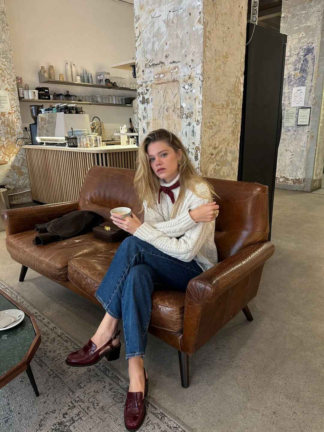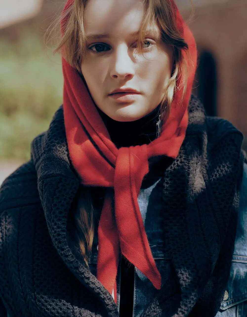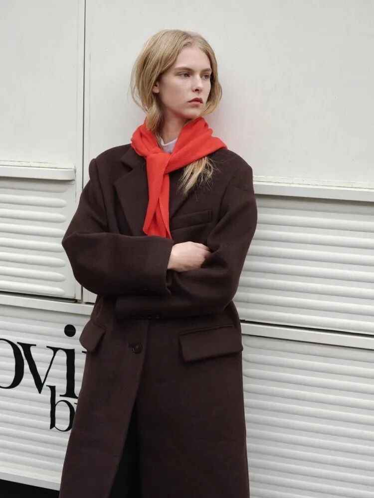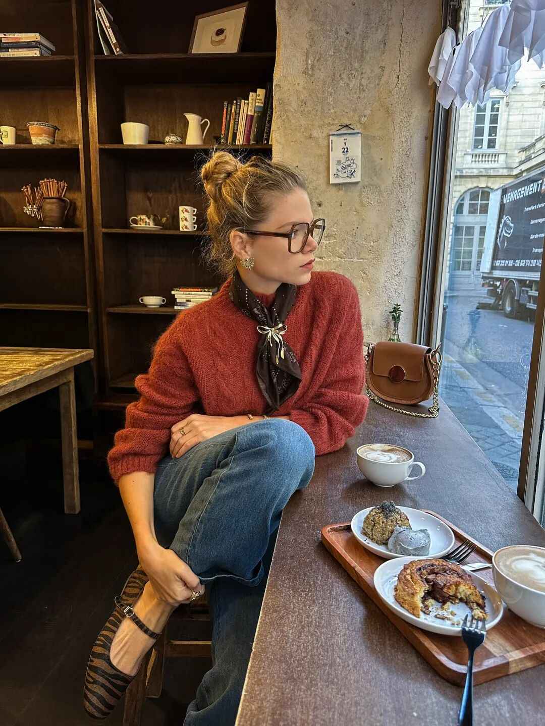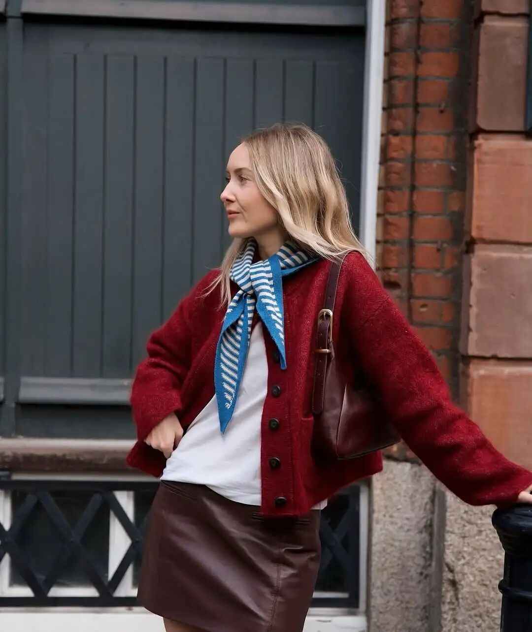 有人担心红色像红领巾,其实毛茸茸的针织质地自带秋冬滤镜,完全不会。棕色毛衣或外套配红色三角巾,是经典不出错的组合。▼