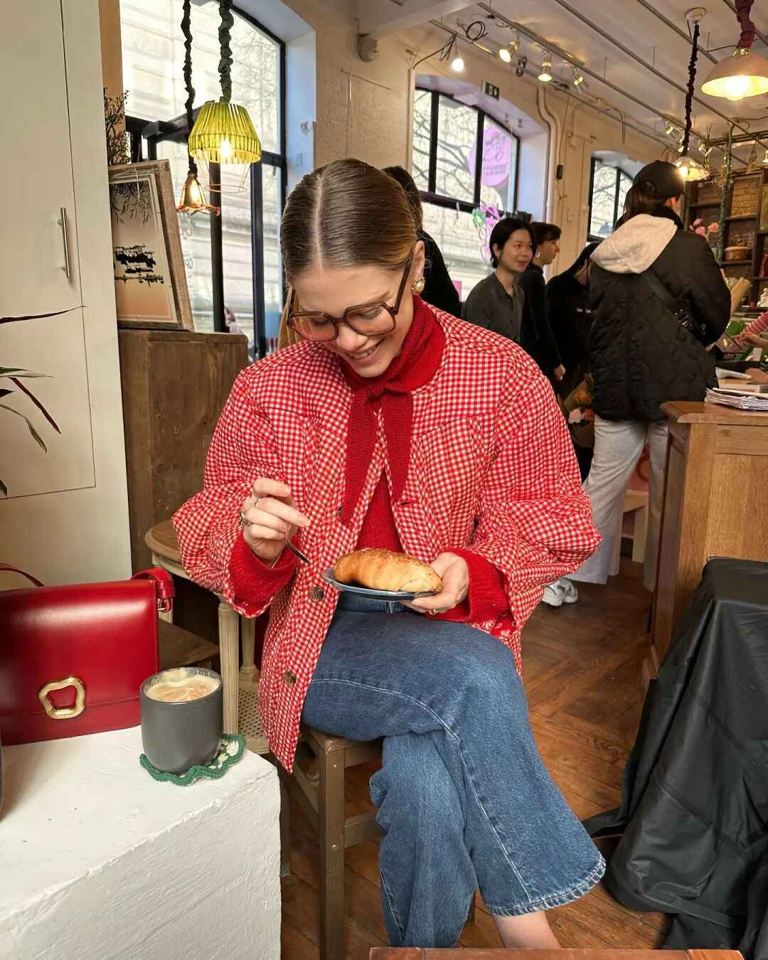 想打破西装的正式感,红色三角巾也是利器。德国博主Marie Fim就这么搭。▼