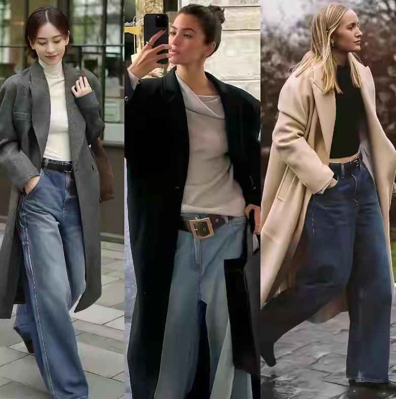 灰色大衣配牛仔阔腿裤也能穿出休闲通勤感,但阔腿裤不能随便选——面料要柔软垂顺,长度到脚踝最好,避免拖沓。