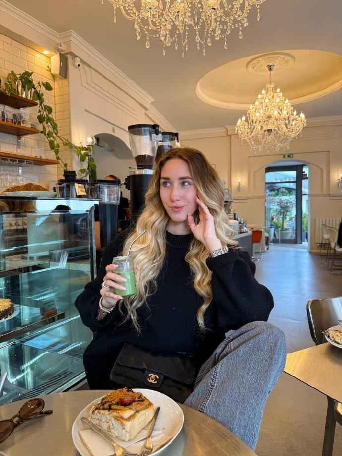 色彩上,Celinekmn钟情于“低饱和大地色”。不是浓烈的焦糖或深绿,而是奶茶棕、燕麦色、浅卡其这类温柔色调,单穿显气质,叠穿也不乱。她有一套经典搭配:浅燕麦高领打底,外搭奶茶棕短款针织开衫,再套件浅卡其长款风衣,三色同系但有深浅过渡,视觉很和谐;下身配烟灰色灯芯绒半身裙,长度到小腿,走路裙摆轻飘,穿双米色短靴,整体没有夸张设计,却把秋日温柔拿捏到位。配饰也坚持“少而精”——细银锁骨链、米色皮托特包、浅棕针织贝雷帽,小细节提升完整度,却不抢镜。