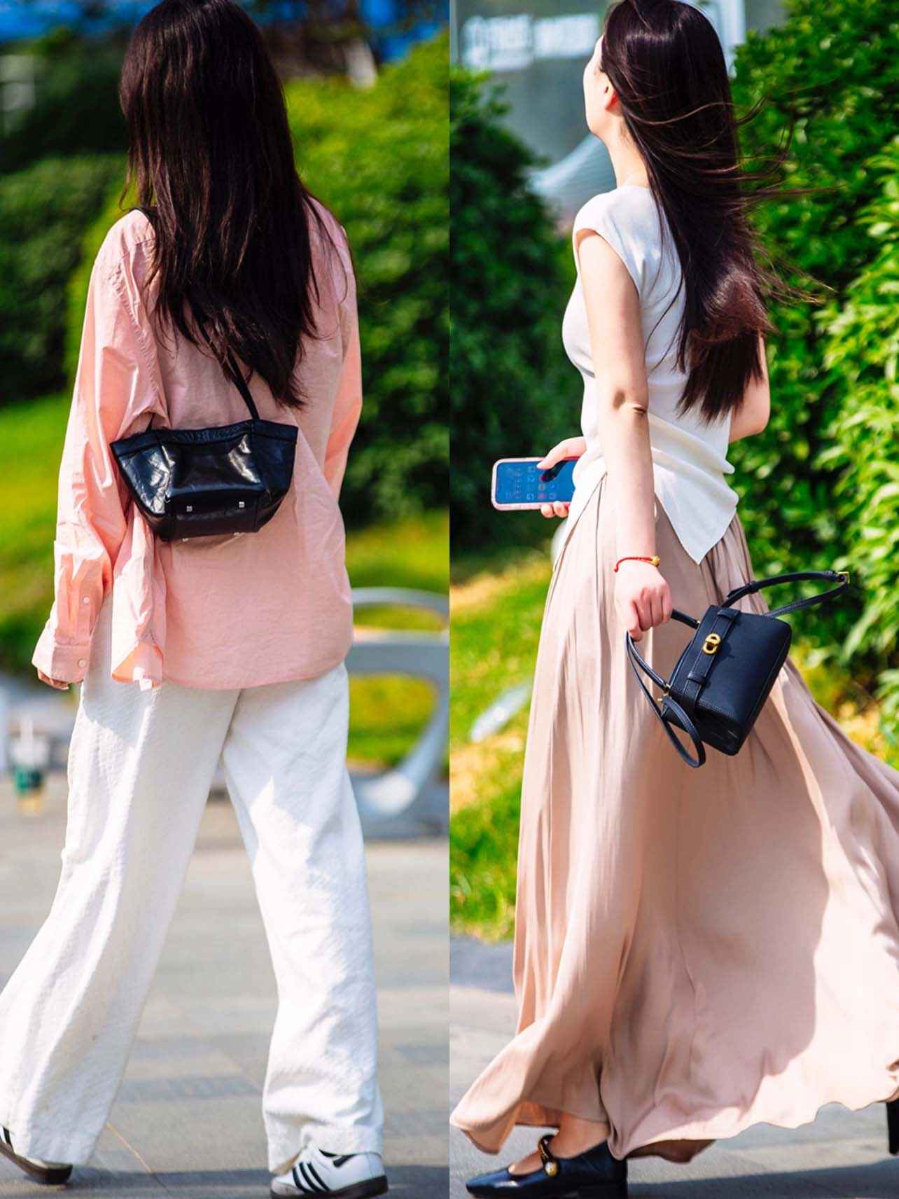 穿高腰长裙时背个腰包,或者用胸包强调腰线,都能让腿长瞬间增加5厘米,小个子也能穿出大气场。