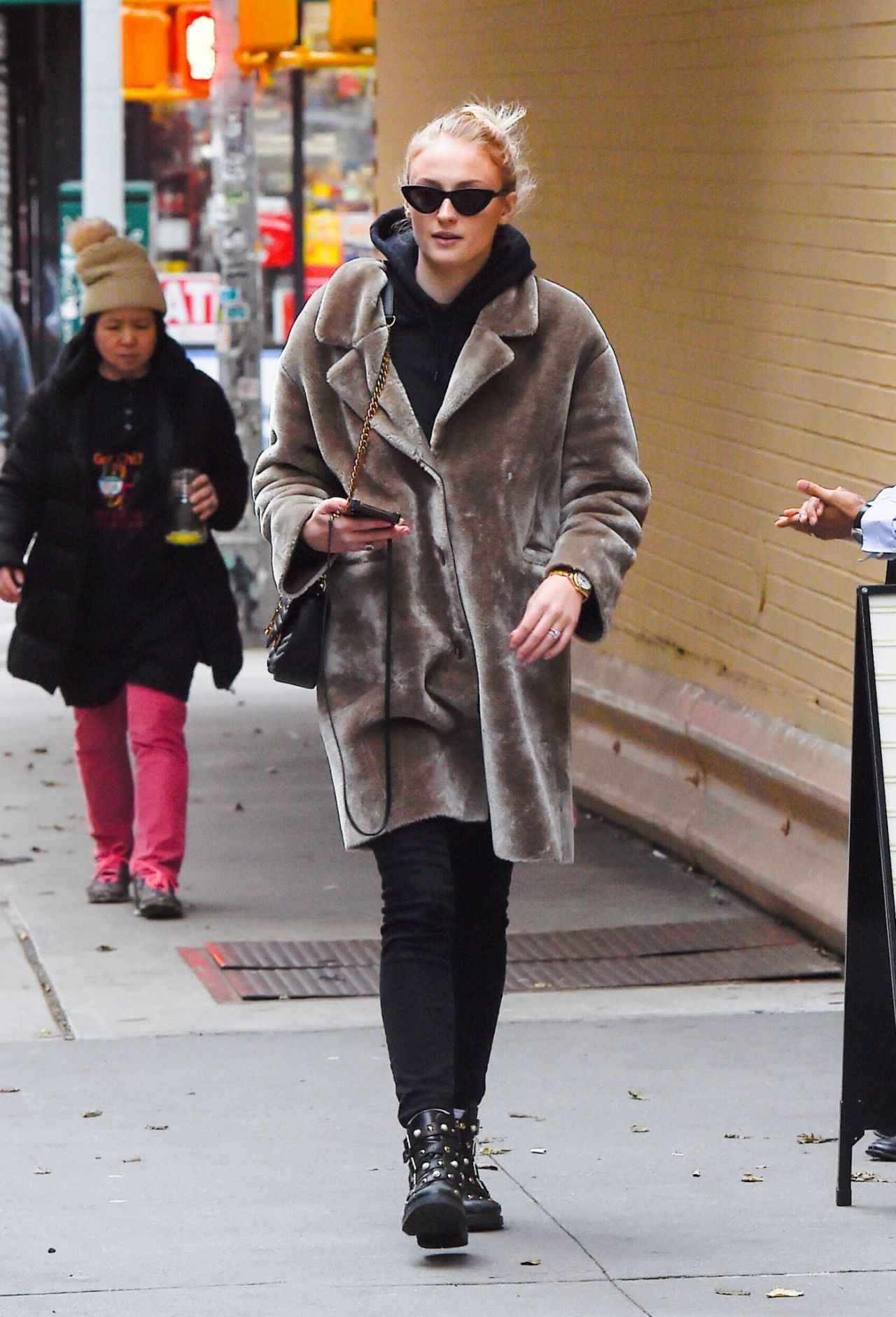 索菲还遵循基础搭配原则,避免全身过于宽松,很多觉得自己胖的女生爱用这招,反而会穿成一团。紧身黑毛衣配高腰裤,直筒休闲款洒脱舒适,自然修身。