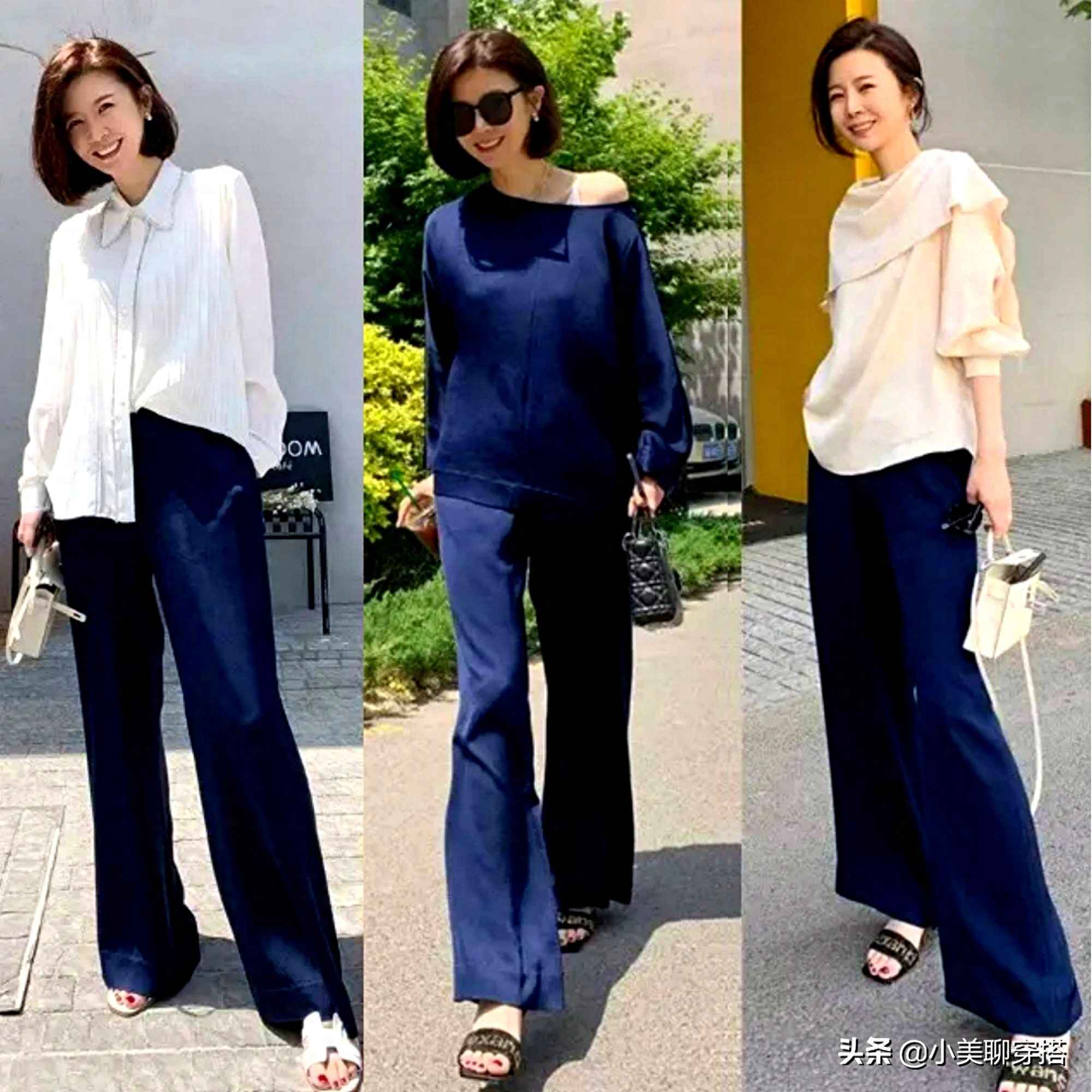 阔腿裤要有垂坠感,面料带点分量,走路时形成“直线+飘动”,修饰腿型。