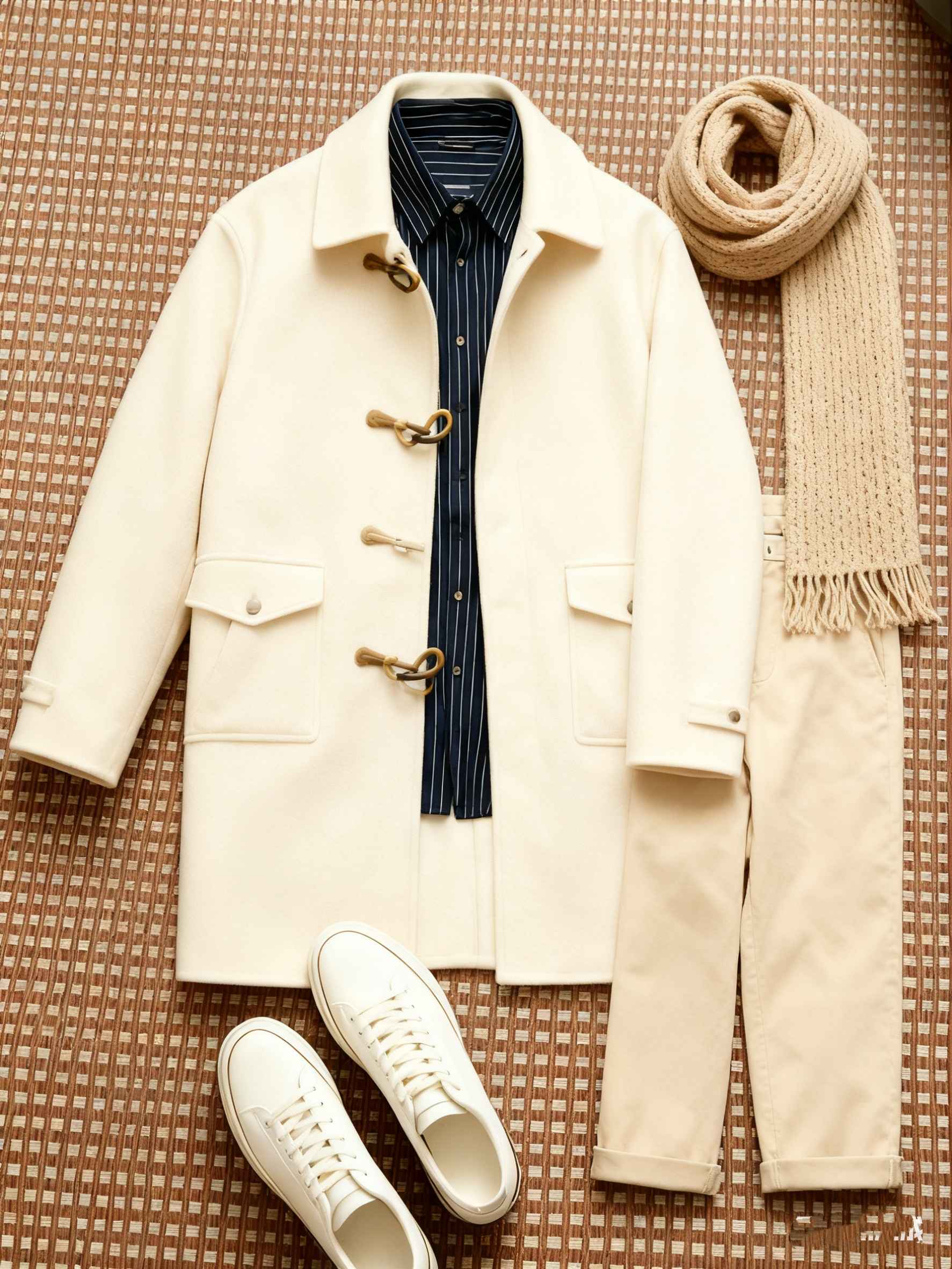 牛角扣大衣是学院风的经典单品:米白主色显得干净清爽,藏青细条纹衬衫领口点缀,浅卡其裤延续暖调;浅驼围巾的粗针织纹理增加温暖感,白鞋让整体更轻盈,穿出校园剧里的阳光少年感。