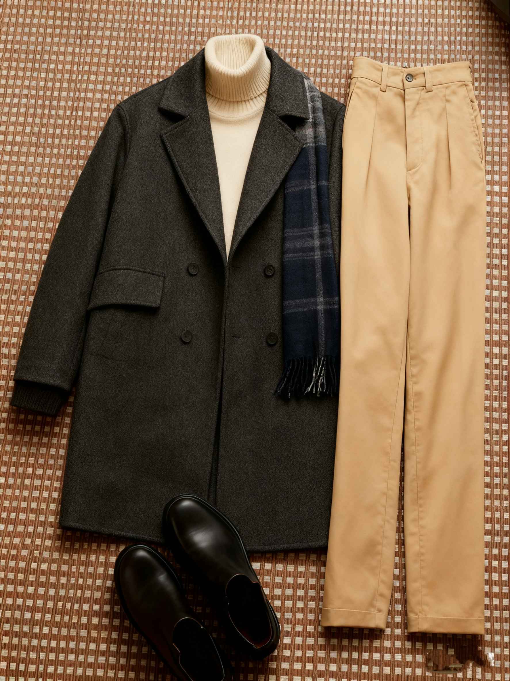 毛呢大衣是秋冬的质感担当:深灰大衣的稳重搭配米白高领的柔和,浅卡其西裤的暖调打破深灰的严肃,藏青格纹围巾增加细节,亮黑皮鞋提升精致度,这套是通勤中兼顾舒适与时尚的理想选择。