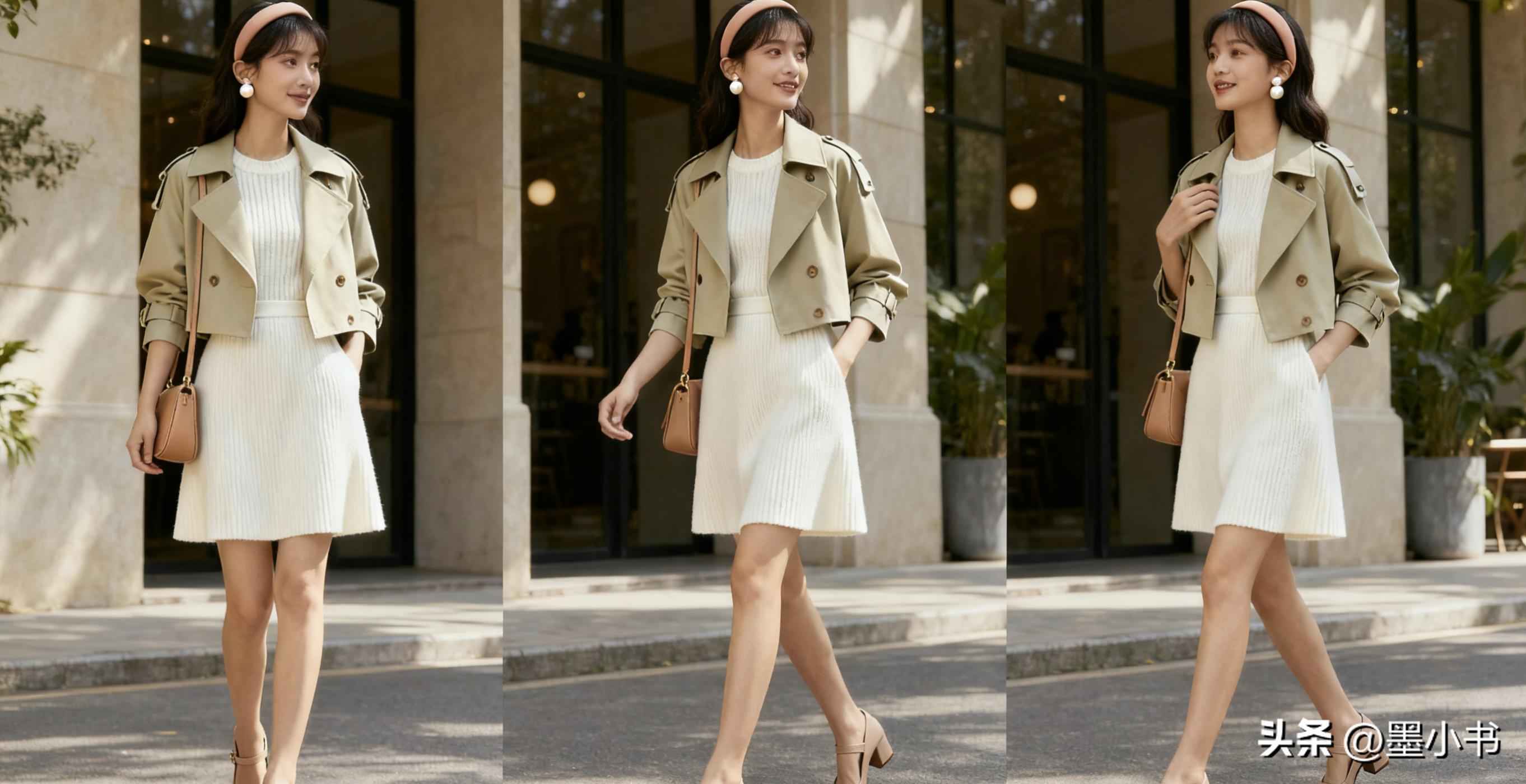 - 核心搭配:奶白色针织连衣裙(收腰A字款)配浅卡其色短款风衣,加上裸色粗跟玛丽珍鞋和珍珠耳钉